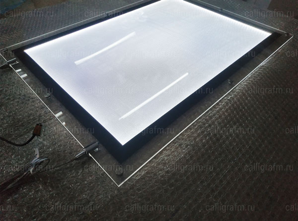 Корпус тонкой световой панели "кристалайт" изготавливается из акрилового стекла. Светорассеивающая матрица засвечивается с торцов светодиодной лентой, благодаря такому подходу световая панель получается тонкой, лёгкой и экономичной. Помимо рабочего поля, светятся и края рамки, это придаёт панели изящный и современный вид.