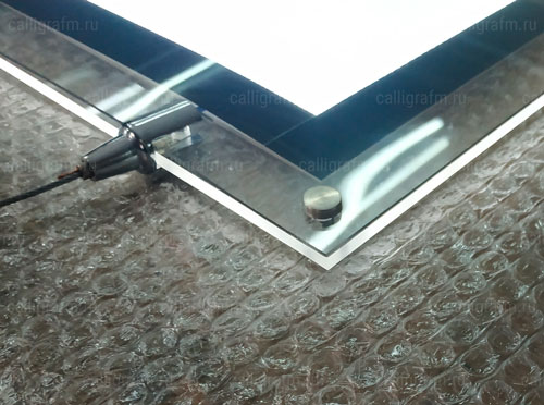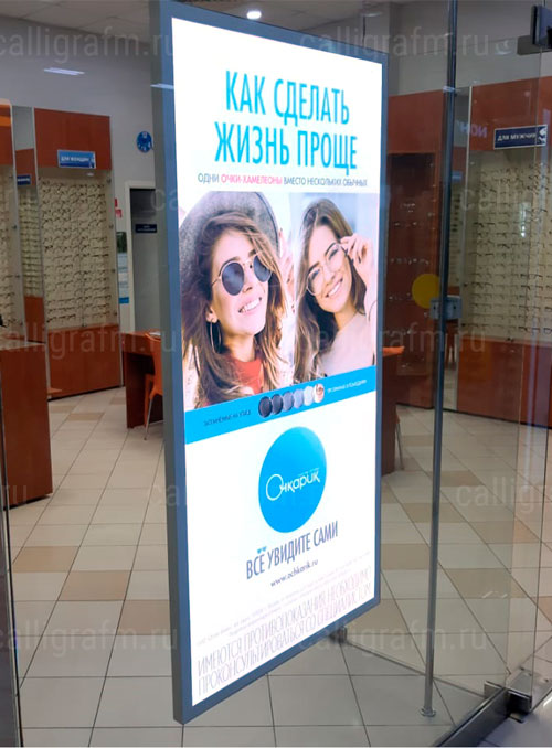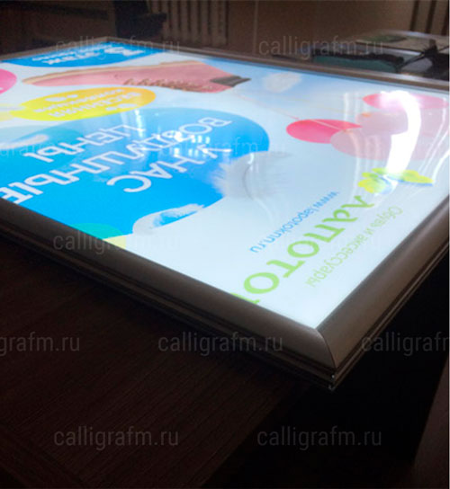 Особенностью данного вида тонких световых панелей является крепление защитного стекла - оно осуществляется с помощью магнитных держателей. Такая конструкция позволяет менять постеры максимально быстро. В основе магнетиков используются те же матрицы, что и в других моделях, соответственно свечение получается таким же ярким и равномерным.